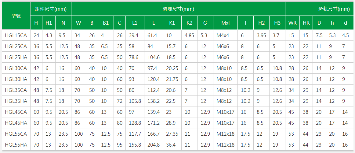 HG系列线性滑轨,为四列式单圆弧牙型接触线性滑轨,同时整合最佳化结构设计之重负荷精密线性滑轨,相较于其他之线性滑轨提昇了负荷与刚性能力;具备四方向等负载特色、及自动调心的功能,可吸收安装面的装配误差,得到高精度的诉求。高速度、高负荷、高刚性与高精度化概念已成为未来全世界工业产品发展的趋势,HG系列线性滑轨,即为基于此理念开发之产品。