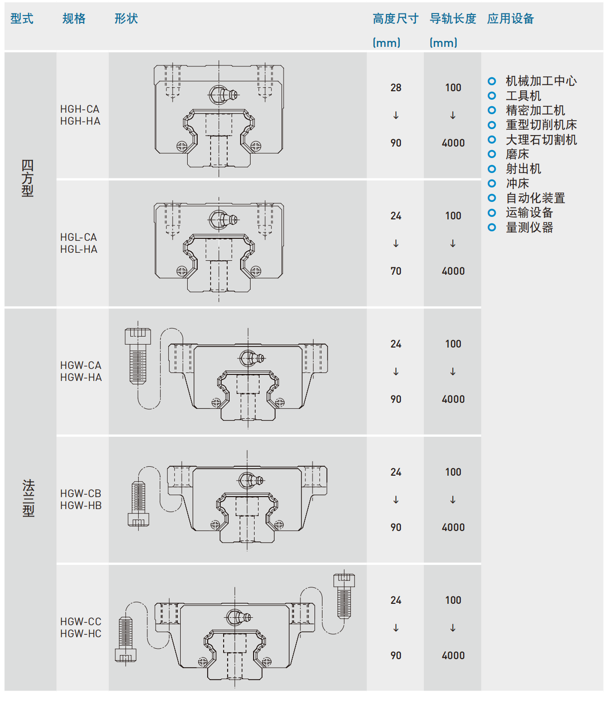 上银导轨分类:HG系列、EG系列、RG系列、MG系列